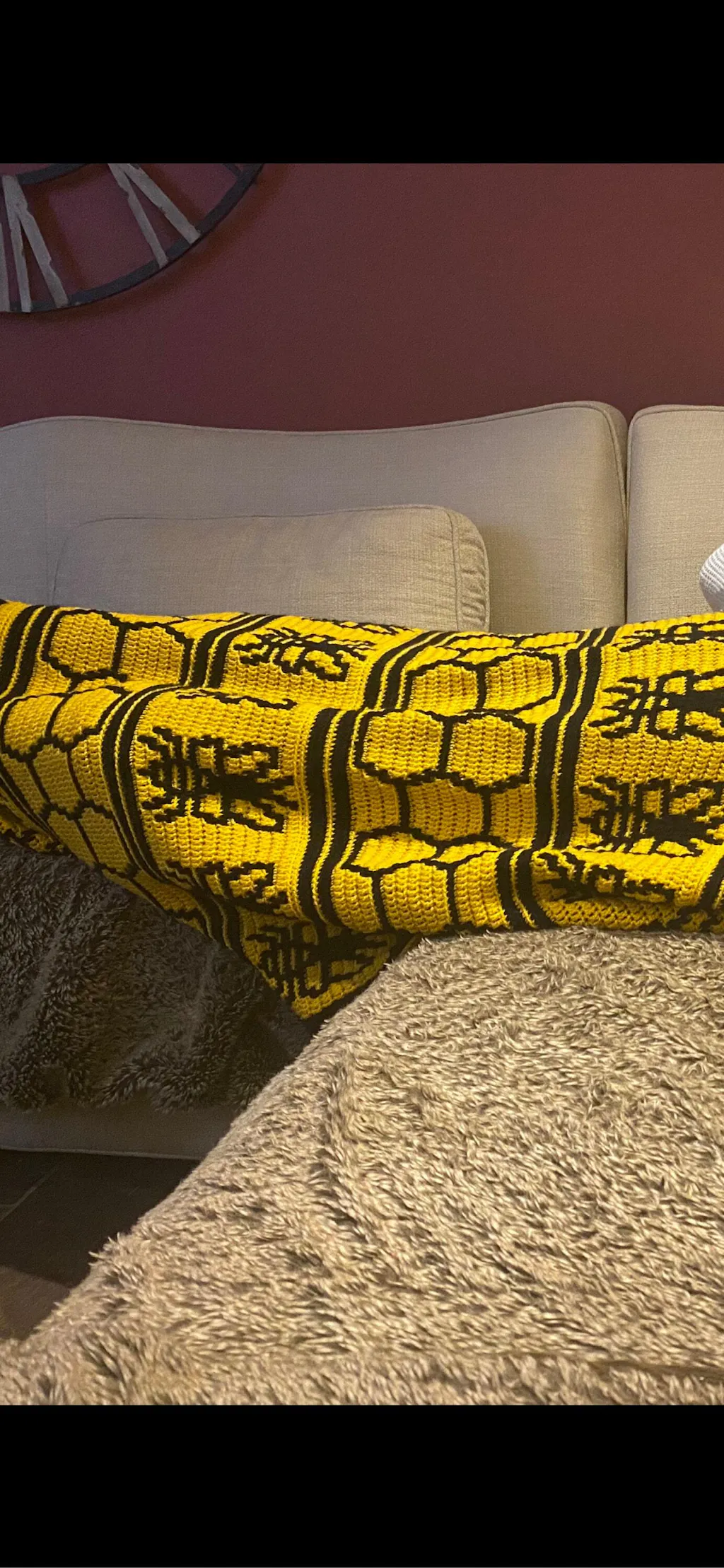 This pattern includes graphs and instructions for an overlay bumblebee mosaic crochet pattern. Each is a 24-stitch repeat, designed to be usable interchangeably with any of my other patterns.
