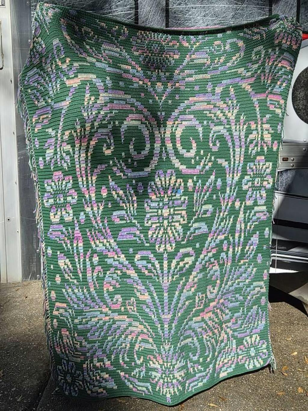 The blanket is 201 stitches wide by 249 rows high and measures approximately 57” by 71” (145 cm by 181 cm) in worsted weight yarn.